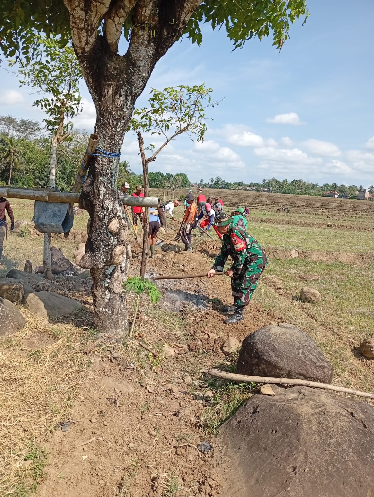 Suasana kebersamaan dan semangat gotong royong terlihat jelas selama kegiatan berlangsung. Warga dan TNI berharap perintisan jalan tani ini dapat segera diselesaikan dan memberikan manfaat nyata bagi masyarakat di dua desa yang terhubung melalui jalur tersebut.